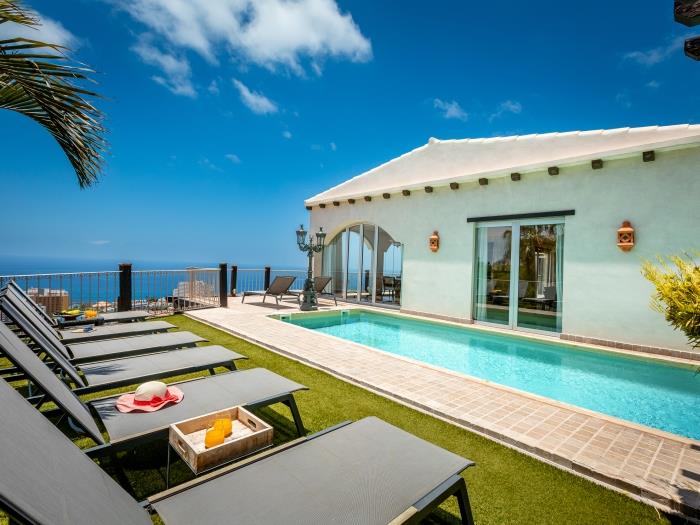 sud de Tenerife. Cette propriété unique allie style, confort et intimité dans un cadre privilégié avec vue panoramique sur l’océan Atlantique.